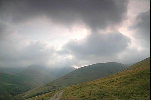 I walked along Howgill Lane and then joined the line of the old Roman Road which runs along the east side of the River Lune. The clouds rolled overhead and it looked like there was a possibility of a downpour. At Birkhaw I took the track up onto the fell and followed and easy farm track around the contour of Seat Knott to the ford at Bram Rigg Beck. The clouds continued to swirl around the high tops, obscuring them from view. |