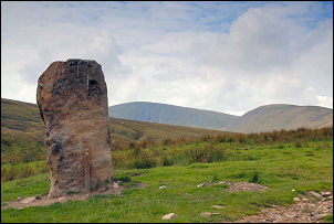 On a clear day this would be a superb vantage point, but not today. I descended to the NW towards the Adamthwaite access road. Just before reaching it I came across a fenced off automated weather station, or more accurately a rain gauge. After crossing the road I took a direct and steep route up Knott and over to the NW to pick up the old track marked on the map. I could see it winding its way towards Long Gill and Green Bell. I didn’t follow it all the way but turned to the left to the saddle between Grere Fell and Adamthwaite Bank. There is nice old drove road here and I followed it part way before descending a gulley towards Adamthwaite. By the path was a large stone monolith which doesn’t appear on the map. A closer inspection showed a lot of digger bucket scars on it which indicated it was probably erected fairly recently, maybe when the adjacent new-ish barn was constructed. |