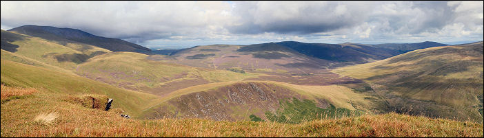 I drove north from Keswick on the A581 and before Bassenthwaite village took the right fork up a narrow lane heading to Orthwaite. A short way up is a decent sized parking area on the right which is were I left my car. I’d had some light rain during the drive from home but it had now stopped. There was plenty of cloud about but it was mostly high, except for some hanging on Skiddaw and obscuring the summit. I started walking north along the road until I reached Peter House Farm. A farm track off to the right is the start of the route to Skiddaw House. I walked along it towards Dash Farm and then took the right fork when the Farm came into sight. There is now a wonderful view up the valley with Whitewater Dash waterfall in the distance. It is quite a good road and most 4 wheel drive vehicles would probably get along OK. At the first gate there was a Landrover parked up but nobody was in sight. As I continued I saw 2 walkers in the distance. They were quite a way apart so I don’t think they were together. At the falls the sun came out briefly and I managed to get a nice photo looking down the valley. |