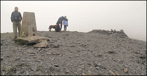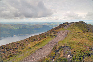 The views were spectacular, particularly the northern horizon. A nice green path took me to Jenkin Hill and then joined the main route up Skiddaw. The path was very busy with many people going up and down. Not much further on I reached the cloud level and nothing much could be seen but just on the final approach to Skiddaw summit trig point the cloud briefly cleared to the left and I was able to see down to Bassenthwaite Lake. |