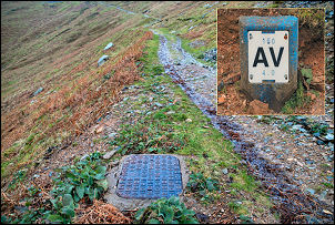 I continued over the pass and started the descent into Boredale. As I descended I was in the lee of Place Fell and found some shelter from the wind. The first part of the descent was quite steep and I noticed a piece of broken cast iron pipe amongst the rocks. A little further on was an air valve chamber lid and a marker post. This all added up to a water pipeline running down to the valley. The source of the water would probably be Hayeswater reservoir, about 3km to the SE. According to the map the water level is about 425m and the Hause is at 399m, which means the water could easily gravitate over the pass. |