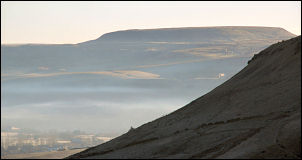 Met Eric and Jack at 7am and drove with 2 cars to the car park at Holcombe near Ramsbottom. Left one car and drove back to the car park at Calf Hey reservoir just off the Grane Road. The idea being to just have to walk one way over the moors. It was a beautiful cold clear morning as we set off. We walked over the Calf Hey reservoir embankment and up the steep path towards the old quarry workings. We turned left to follow an easier path to get up to the ruined quarry buildings and the chimney. |