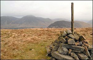 The wind was now quite strong so I pressed on to Blake Fell where I knew there was some shelter in a small nook near the summit. It was still overcast but I did have some distant views. I had my sandwiches where I found shelter and continued over the summit before heading steeply down towards Carling Knott. Carling Knott is accessed by a spur from the main range. There is no defined path up to it from the valley and so it is probably not visited very often. But it is definitely worth a visit. The path along it is interesting and varied with great views on both sides. Rocky outcrops abound on the SE side and these provide good shelter from the westerly winds; a perfect spot for a lunch break or just to sit down and admire the spectacular views of Mellbreak and Grasmoor. |