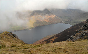 My first objective was Illgill Head which was way up to the left. I couldn’t see the summit or much of the climb because of cloud but the slope didn’t seem too bad. I climbed steeply down to Robin Gill, stepped over and began the climb up Little Grain Gill. The cloud began to clear a bit and the views improved all the time. There was hardly any wind so I picked a nice rock about a third the way up to stop for a sit down and drink of coffee. There was no path but no problems continuing the climb. As I came towards the summit the gradient eased and I was able to see a little more of the ridge. I passed some rock outcrops but the summit cairn was on a large flat area. Enough clouds rolled away to reveal Wastwater below. I followed the main path for a while then left it to descend a little to the top edge of ‘The Screes’ and to find shelter from the wind before stopping to eat my sandwiches. |