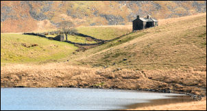 At the river is a footbridge but the map shows a path on either side of the river. I wanted to go up the left side of the valley but there was a rope stretched across the path so I reluctantly crossed the bridge and headed up an even muddier track. I waded through cow muck then just plain mud until I caught sight of Bakerstead which is shown on the map as an Outdoor Pursuits Centre. The way I wanted to go was by the building so I had to get across the river again. When I got down to the bank there was only a ford and it was too wide to hop across so I took boots and socks off and waded. When I reached the building I noticed a makeshift footbridge of logs which isn’t marked on the map. Nobody was about so I continued past the ruins of Miterdale Head and up onto the moor. Once clear of the Pine trees the views began to open out and it was drier underfoot. |