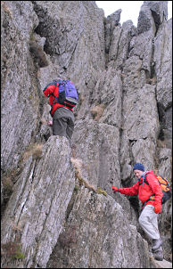 I’m glad I was with people who knew the mountain because I wouldn’t want to tackle it for the first time on my own. There was still cloud around and all the high summits were obscured, including Tryfan. The first part of the path was steep, well made and quite pedestrian; this was soon to change. Just before we reached the cloud base the path took a turn for the vertical. The climbs were steep but not particularly exposed and with plenty of big hand and footholds it was very enjoyable. The terrain continued like this all the way to the summit. At the top it was no place to hang around in the cold wind and mist. |
