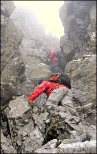 A fairly steep descent followed and the group separated from time to time as we found our way through the maze of huge boulders and crevasses. We reached a wall and stile to regroup and decide the next phase of the rout. We were on the saddle at Bwlch Tryfan and now had the climb of Glyder Fach in front of us. I was my first visit to this part of the mountain and had no idea what to expect; I think the others did. Four of us pressed on up through the rocks and mist while the rest took another route which I think followed a path most of the way. We were soon looking up wet and misty vertical gulleys. The climbing was quite uncomfortable in places due to the wet and cold and I’m glad I was with experienced mountaineers who’d been this way before. This is certainly a way I wouldn’t tackle on my own in wet and misty weather. |
