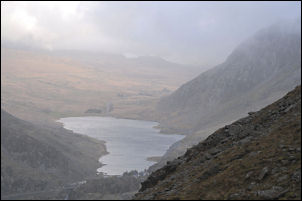 Eventually we emerged onto a flattish area and a path with people about. I was surprised how many people were on the mountain in the misty conditions. We didn’t have a sound plan to regroup, other that use mobile phones to keep in touch. Unfortunately none of us could get a signal so we pressed on hoping the weather would clear or we’d come across them. The wind increased in ferocity so we found an excellent shaped rock feature which gave good shelter where we could stop for lunch. We navigated to Glyder Fawr by compass as the path was indistinct over the rough rocks. A very steep descent followed over lots of horrible loose scree, but at least we got a view of the valley below. At the bottom was the very windswept lake of Llyn y Cwn. We had hoped to see the others here but there was no sign. We pressed on back into the mist and up the steady path to the summit of Y Garn. I had to leave the group here as they were continuing to Nant Peris but I had to get back to my car. I’d planned to follow the ridge down just to the north but when we got there the descent path looked very rocky, exposed and uninviting in the mist. In the distance I could see a safer looking descent so stayed with the others until we came to the saddle before Foel-goch. We said goodbye and they set off towards Elidir Fawr while I started my descent on nice soft grass. |