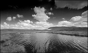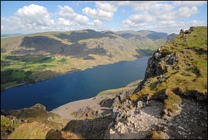 I continued up Whin Rigg to the summit to be treated with some superb views of the surrounding mountains. I found shelter from the wind behind some rocks and decided to stop for lunch. The sun came and went but the cloudscapes were very impressive. Continuing to Illgill Head I passed between the two tarns that I briefly saw though the mist last week. They seemed smaller now that I could see their full extent. |