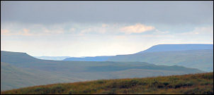 It had been substantially upgraded by the use of large stone slabs. Two walkers were just coming to the summit and then turned to head for the Ordnance Survey trig point. I followed them and after a brief chat they headed off to the SE and I set off down on the path to the SW. it was quite steep in places and a heavy shower of rain didn’t help. I found some shelter behind the wall and stayed put until the worst had passed. At Ackerley Moor I came to a nice green track heading directly back to Litton. It took an easy diagonal route down the hillside and after crossing a wooden footbridge then through a farmyard I returned to the Queens Arms Inn and then my car. |