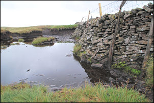 I reached the end of the stone wall and began to follow a wire fence. Ahead was a shallow saddle and Moss Top in the distance. The surface was generally firm but unfortunately I had to cross some very wet and muddy areas. Sometimes I was able to hang on to the fence and sometimes a wide detour was needed. Some work had been done by fitting new gates in the wall I had to cross. |