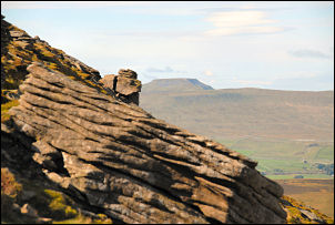The footpath route wasn’t clear and I only found it by accident. It followed a diagonal line up until it came to the road. The road ahead was flat, deserted and had a nice view of Pen-y-Ghent in the distance. As I got closer I began to wonder which would be the best way to the top. I’d intended following the road and follow the traditional route via the Pennine Way. However, the SE face looked very inviting and it looked like I could get to it without having to scale any walls or fences. When I got to the area known as Giant’s Grave I left the road and headed across rough open round towards the mountain. After crossing Crooke Gill I headed for a wall that ran steeply up the fell. I hadn’t been climbing long before the wall became quite dilapidated and I was able step over it and onto the open hillside where I was able to continue climbing above the limestone outcrops and onto the grassy summit. |