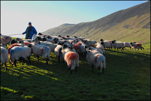Then the weather was miserable rain and no visibility, which is why I’d returned to see what I missed the last time. I set off north up Barbondale in the chilly sunshine. The walking was very pleasant and as last time there was quite a bit of traffic on such a remote road. Barkin Beck on the left is the home to quite a few interesting caves and potholes. None of which I’ve visited. The map shows some of their wonderful names; Wonderland Cave, Strike Cave, Crack Pot etc. Near the high point on the road I reached the right turn up the rough track Called Green Lane, which isn’t very green. There were nice views down onto Dentdale and also across to the Howgill Fells. Up on the right a farmer was tending his flock of sheep and it was nice to pause for a moment to watch him at work. |