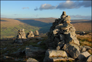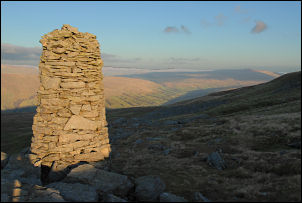 Just before the summit I saw an interesting tall cairn away to my right. It was on a small rocky outcrop and was another excellent viewpoint. Again I followed the wall until I reached the trig point on Crag Hill. It was so nice to have a view at my third visit. I pondered a while before setting off on the chilly descent to Bull Pot Farm. With such a late start the sun was starting to get near the horizon and by the time I reached the farm the light was fading. A few cars were parked nearby and some walkers had just returned to them, making the most of the good weather as I had done. I followed Aygill down to Blindbeck Bridge in Barbondale and back to my car. |