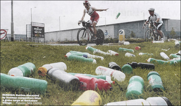 ‘RUBBISH: Bottles discarded by Ironman competitors litter a