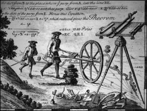 Early surveyors with their measuring wheel. |