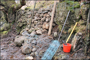 The Stake Pass path took me down to Langstrath valley bottom where I crossed the footbridge over the beck and down to the fell-gate and the stony track that returns to Stonethwaite. Some wall repairs were being done by a park ranger who I passed as he had a break from his work. |