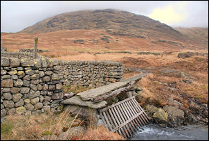 As I drove to the summit of Wrynose Pass the weather deteriorated a little. I could still see at the summit but the mountain tops were in cloud. I set off to descend the pass to the west into a gloomy Wrynose Bottom. For the first part of my walk I was on the road so I was able to cover the couple of miles to Cockley Beck fairly quickly. I crossed over by the main road bridge and then over Moasdale Beck using the pedestrian bridge which is constructed from long flat stone flags. I’d been over the bridge before doing a similar walk but this time I wanted to head up Moasdale for a while before climbing Little Stand. Previously I’d followed the line of a footpath show on the map but there isn’t one so the climb was a bit tricky. I followed some very wet ground to the left of Clemety Syke until I came to a gate hole in the wall. |