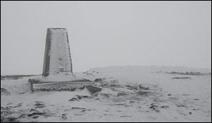 The snow soon got quite deep in places and I searched out a sheltered spot to stop and eat my sandwiches. I continued up and was soon in thick cloud and bad snow. Luckily I was following the fence which also forms the path line. It was slow going and as I left the fence to follow a compass bearing towards the summit trig point I was easily disorientated due to the white out conditions. Eventually I reached the trig point and took a couple of quick snaps before following tracks in the snow towards the main descent path. There was no sign of the path itself due to the snow so I kept following the tracks. I soon found myself descending too steep. I followed a compass bearing to bring me back to the correct path and soon was below the cloud and had a nice view of the correct way ahead. By now many people were coming up but I thing it was really too late in the day for an ascent. Once on the main path it was an easy walk back to the car park. |