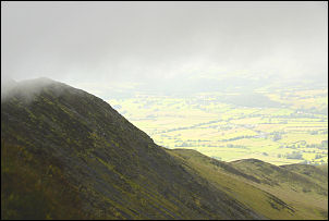 The weather forecast was gloomy. I arrived at the Skiddaw car park and set off just after 8 heading back down the road towards Applethwaite. The plan was to walk over Skiddaw along a one way walk over Ullock Pike. To get to the start I needed to reach Parker Gate, some miles along the busy A591. The road doesn’t have a footpath and is not safe to walk along so I decided to catch the bus. The X4 leaves Keswick at 9:14 so I needed to be at the Millbeck Road end for 9:21am. I am not very good at estimating my walking times so I set of walking quite briskly. I reached the Underscar Hotel and realised I was going to be very early. I continued along the lanes to the bus stop on the A591. It was only 8:35 when I arrived so I was far too early. I didn’t fancy hanging around for nearly an hour so decided to brave the traffic and set off along the main road until I reached a bus stop with less of a waiting time. I kept going for a bit over 2 miles until I reached Little Crosthwaite at 9:19am. There was a bus stop and the time was just right. Within a few minutes the bus arrived and I paid £1.30 to get to Parker Gate bus stop. It was only a couple more miles but I’m glad I did because of the safety aspect. I got off the bus and set off up the lane in light drizzle. Just past the small car parking area on the right is gate which leads up towards the fell. |