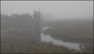 I kept climbing through the gloom until the cairn and wind break on the summit of Selside came in to view. I followed the fence to the SW until I guessed I was adjacent to the un-names summit to the left. One of my objectives was to find a stone pillar that is shown on ‘Google Earth’ and is somewhere on this fell. I had noted the exact position and entered it into my GPS unit. The thick mist was certainly a hindrance and I only had a few metres visibility. With nothing to see I followed the GPS until I arrived at the coordinates. There was nothing to see so I wandered round in a circle for a while before heading off in the direction of Branstree. |