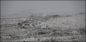 I reached the Corney Fell road and saw several cars heading up over it. There was about 10mm on snow on it and it was even slippery to walk on. I headed steadily up and saw the road vanishing into the cloud. At a bend in the road where Black Beck flows under the bridge there was a car stuck in the verge. The driver must have got a lift out of the area as there was nobody about. I left the scene and carried on to the summit where I left the road and turned right to head up by the wall towards Buckbarrow Crag. |