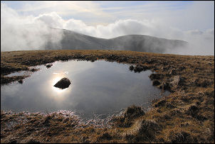 It was quite boggy so I kept high above Ellergill Beck, passed an old ruin and came to a dead end. There was nothing for it but to climb the wall and fence and I managed it without doing any damage to the wall or me. I eventually rejoined the correct path at Beck Houses Gate. Continuing up I joined a delightful path below brown Moor and heading towards Whin’s End. It followed a steady gradient and was well constructed and must be an old drove road. By now I’d left the mist behind and had good views. In Whin’s End there was a nice spot to sit in the sun and enjoy the view while eating my sasndwiches. |