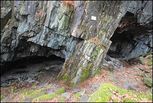 I then descended to Rosthwaite and crossed the road to follow the track to the River Derwent. On Wednesday I’d seen a sign saying that Millican Dalton’s cave [Millican Dalton (1867-1947) was a self-styled "Professor of Adventure"] was closed due to rock fall. I wanted to check this out so followed the path through the woods until I came to the unmarked branch up to the cave. When I got to the entrance there were more signs fixed to the cave entrance area but I couldn’t see any evidence of a rock fall. |