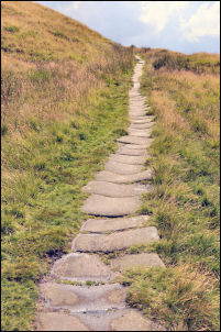 I reached the entrance to the staircase just as the rain became torrential. Fortunately it didn’t last long. The stone stairway was pitch black so I need my torch to follow it up to the balcony but there wasn’t much of a view through the driving rain. The entrance was quite sheltered so it was the ideal place to stop for my lunch before continuing along the ridge path. Above Mankinholes is a very nice descent path which the map calls Long Causeway. |