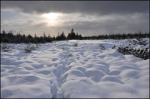 At a footpath sign I left the road and headed off west across the fields towards Heath Farm. The snow was deep and not good for walking through. It took quite a while to get through the fields and when I was in sight of the farm a sudden snow blizzard appeared out of nowhere. I crossed the last field as quick as I could to reach Heath Farm and some shelter. The whole place was deserted and looked like a modernised weekend retreat. A path headed north towards the pine woods and it was reasonable going thought the wooded stretch but was a bit difficult for route finding. |