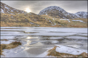 One major advantage of frozen and hard ground is my boots keep dry. The path to Styhead Tarn and Styhead is notorious for being awash with water, but not today. I stopped briefly at Styhead Tarn to take in the impressive grey sky reflected in the iced over tarn. I continued up to Styhead summit as far as the First Aid Box then turned left to head across towards The Band. The ground was nice and hard due to the frost so the walking was easy. I kept on the path towards Sprinkling Tarn but turned off to the right before reaching it. The Band is a good northern approach to Great End but there is no obvious path. I was soon on the ridge heading steadily upwards. |