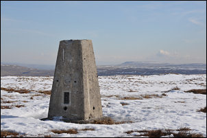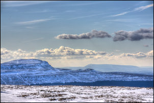 Approaching Gaudy House the path leaves the track and follows the wall side up on to the fell. There was still a lot of drifted snow around and most of the gates had to be climbed over as they were snowed shut. I was still on the Pennine Way route and as I got higher the views were still good and I could see down into Snaizeholme Beck while up ahead Ingleborough came in to view. There was even more snow and not much clear ground to walk on. I was heading for the trig point on Dodd Fell Hill but the snow fields to my left were too steep to get up. By the time the gradient had eased I had to turn back on myself to climb up to the fell top. |