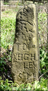 marker saying 5 miles to Keighley with a pointing finger showing the