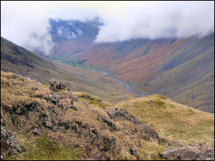 ahead I was out of the mist and had a view of Styhead Pass ahead.