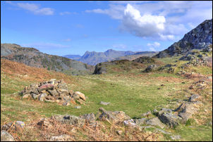 I followed the tarmac along an intricate series of twists and turns to Low Oxen, High Park, Stang End and Low Hall Garth. Here I left the tarmac and continued along the stoned track to Greenburn. The views were now opening up and I could see the ridge of Wet Side Edge looming ahead. I wasn’t going that way as I wanted to investigate the north face of Wetherlam. I passed though the gate before the final climb to the old quarries and found some shelter behind the wall to have my sandwiches. I continued past the Greenburn Copper Mine Works and looked up the high rock faces ahead. I wasn’t sure of the best ascent route so headed for the spoil heap of the disused Long Crag level mine. |