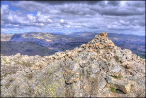 It was a straightforward climb and a very worthwhile viewpoint when I got there. The Coniston Copper Mines book by Eric Holland describes the level as going 516ft into the mountain with 332ft of side passages. I continued upwards then through a steep area of rocks to a small promontory where there were even better views. From here it was an easy scramble to the path that leads to the summit of Wetherlam. The weather continued fine and I had excellent views from the summit. Considering the time of year it was quite cold and as I started my descent there was a short shower of hail. |