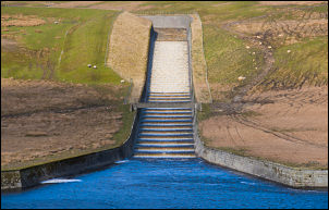 Further on I saw a path sign heading through a gate. It took me along a track and through another gate and nowhere near the route the map shows. I headed over White Hill and across some boggy ground before seeing a wall ahead. I reached it and turned right to head for the Broad Stone boundary stone where the path is indicated by a stile through the wall. The wide view of Lunedale opened up ahead and a faint path indicated the way. I left it for a while to explore a sheepfold area to my right. The buildings were quite substantial but looked secure and probably locked. I was hoping to find some shelter from the wind. I re-joined the path and headed down to the farm buildings at Lane Head. This is certainly an area of reservoirs. In front of me was the massive dam of Selset Reservoir. With a top water level of 310m it was completed in 1960. The overflow and weirs are quite interesting. I reached Kelton Lane and followed it to the buildings at How. |