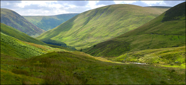 I’m glad I did as the descent was easy and the valley bottom quite interesting in appearance. I crossed the river and headed up for a track that had been cut in the hillside. Once there it was an easy walk along the contour towards Meggethead. I didn’t need to go near the buildings as there was an easy grassy route to the road ahead. The road was an easy walk along Megget Water and an easy uphill walk back to the car. |