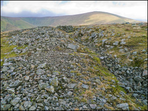 Leaving the wall I turned left to cross a short stretch of open fell to the Birkett Fell summit cairn. It’s quite unique as there is a name plate bolted on the cairn saying ‘Birkett Fell’. I can’t think of any other cairn with a nameplate except for memorial cairns. My next objective was Hart Side with its collection of cairns. There is also an interesting scar feature over the summit. It’s a trench excavated in the rock and certainly looks man-made. It runs in a straight line and may have been an exploration cutting for minerals or mining, but that’s only my theory. The path then headed towards Stybarrow Dodd along an interesting route that followed the valley side above Deepdale, giving nice views across to Great Dodd. Over Stybarrow Dodd the wind was really blowing and I wanted to find some shelter to eat my lunch. |