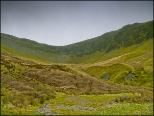 My original plan was to walk along the road over Whinlatter Pass and climb Hopegill Head from the NW ridge. I decided to walk up to Hobcarton Gill instead and see if there was a way up to the ridge. Over Whinlatter it was straightforward going up but over the summit the headwind was gusting very strongly. After passing Swinside Houses I took the small track to the left which descends to a stone slab bride across Blaze Beck. |