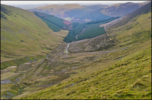 I had no alternative but to continue along the forestry track to get round to the next firebreak. At the next one there was still no sign of a gap but I noticed a faint path heading into the pines. I followed it and managed to get through the dense pines but this was definitely no longer a firebreak, even though it is clearly shown on the map. I got clear of the trees and on to open fell but there was no sign of the good sheep track that Wainwright mentions. I climbed up to the 500m contour and followed it along the fell side to the head of the valley. From a distance Hobcarton Crag looks like an impenetrable barrier but Wainwright’s guide mentions a grassy bank that climbs to the left. |