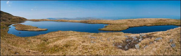 The weather was now quite warm and clouds of annoying flies rose from the grass as I passed. I left the fence at the western end of the fell where there were a succession of tall stone cairns. I followed them NE then across some old quarry workings to the Trig Point. Then I descended Sandtarn Riggs down to the tarn. This is one of those hidden gems. The tarn sits in a slight depression and can only be seen from a small area of the west side of Wild Boar Fell. However, on the bank just above the tarn it is possible to see all around with magnificent views if the weather is clear. |