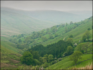I continued down the lane to the woods where I turned left down a steep track to the bridge over the Rawthey River. A nice track continued across Bluecaster and had nice views across to the Howgills. |
