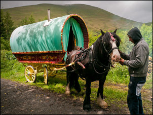 There is supposed to be a public footpath here heading down to Ecker Secker Beck but there was no way-post or any sign of it. Reluctantly I continued down the lane to the main road where I turned right to join the bottom of the Bluecaster Side access lane. The caravan was still there but the tent had been packed away. Two men were hitching up the horse to the caravan and I hoped they’d be gone by the time I drove back down the lane. |