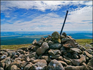 It was a steady climb and the summit is marked with a very large cairn. The weather had started to improve and the cloud began to thin giving some nice views, even as far as the Solway Firth 37km (23miles) away. I had a clear view back to Kinnelhead and started on a direct line to it. The first part of the descent was steep but soon eased as I reached the wonderfully named Pot of Ae, which is nothing more than a small gate in a fence by the pine plantation. |