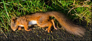 The recent heavy rain had stopped and low sun shone across the sodden fields as I walked back along the road towards Milburn. Passing Gullom Holme I noticed a dead red squirrel in the road, probably a recent victim of a passing car. Its colour was a delicate shade of reddish brown and it was the first time I’d seen one close up. I moved it to the grass verge. |