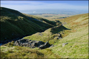 After a pleasant stop at the mine and a closer look at the ruin I headed steeply up Middle Tongue to the north. The gradient eased and for a while and it was fairly dry underfoot. On the edge of Blea Crag I came to an old cairn then headed NE towards my next objective. I’d seen an old disused dam on the map and wanted to check it out. As I approached it there were some interesting shake holes indicating interesting geology below ground. The dam was quite large and originally held back a substantial reservoir. The outlet area was breached so no water was retained. |