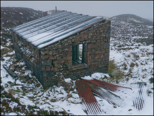 My next objective was a Shooting Cabin which is shown on the map. After following a compass bearing for a while I came across a path and soon reached the hut. It was a substantial stone building with its roof still on, though the windows and door were missing. Nearby were the remains of another cabin which seemed to have been made out of a timber frame and corrugated metal sheets. All that remained was part of the timber frame. |