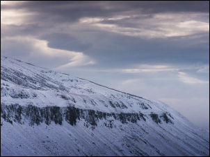 I reached it at the line of and old stone wall. On larger scale maps it is shown as a dash line, almost exactly the same as a path. My Garmin GPS has Topo maps loaded and the wall line is clearly labelled as a path. The head wind was making the going tough. I could see the snow plastered rocks of High Cup Nick ahead but is seemed to take ages to get there. I took advantage of some shelter behind a large boulder to have my butties then continued into the wind. The climb up wasn’t as difficult as it looked from a distance. Near the top there was a nice traverse in deep snow which took my up the final gully. As soon as I got on the summit plateau I knew I had to get down as soon as possible as it was very difficult just standing up. |