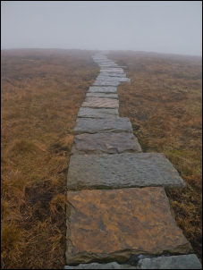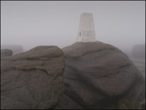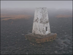 I wasn’t visiting the cross today as I wanted to check out the trig post on Brown Knoll. I had no idea what the path would be like so I was pleasantly surprised to see that it was old stone flags placed on the surface. They didn’t look like they’d been there all that long. Unfortunately there was no official path for the last stretch to Brown Knoll and I had to navigate across featureless moor in the mist. The post was surrounded by mud. |